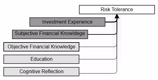 On the other hand, direct stock and mutual fund experience and subjective financial knowledge (self-evaluations), which are closely associated with perceived financial decision-making confidence, are shown to have the greatest influence on risk tolerance. These factors are directly related to the cognitive and emotional aspects of financial decision-making. It turns out these factors are more related than general traits such as cognitive ability or education, thus making them better predictors of financial risk tolerance. The emerging research on the importance of subjective financial knowledge, and its mediating relationship with investing experience, suggests that confidence can assist individuals in navigating complex financial situations, even when their objective knowledge is lacking, and that enhancing investing experience can further support the effect of confidence on risk tolerance.’